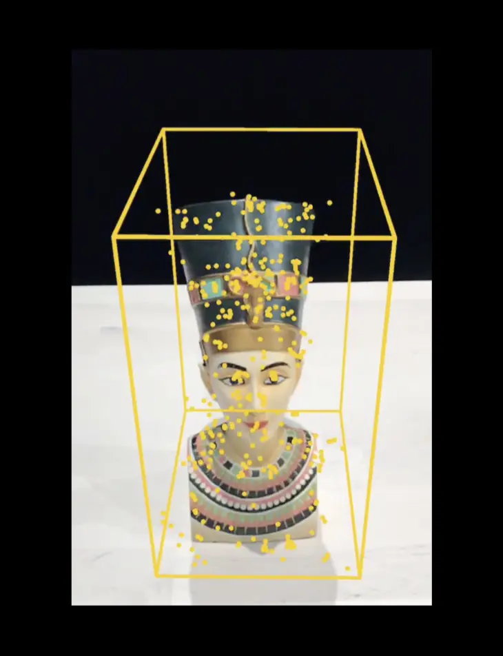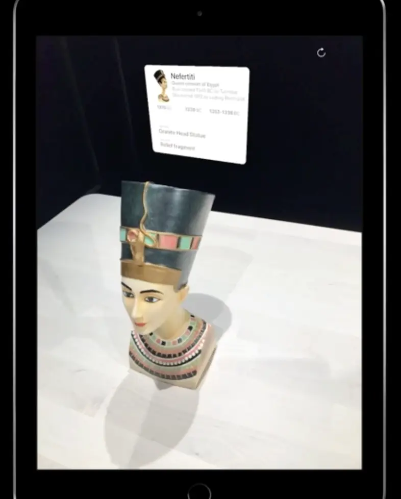 这个半身雕像进入 iOS 的视图中后,可以得到 6 自由度的 pose,利用它在雕像头顶浮现一个非常简单的信息图形,包括这位埃及女王的姓名(Nefertiti)以及她的出生日期,当然还可以添加任意渲染引擎支持的内容。