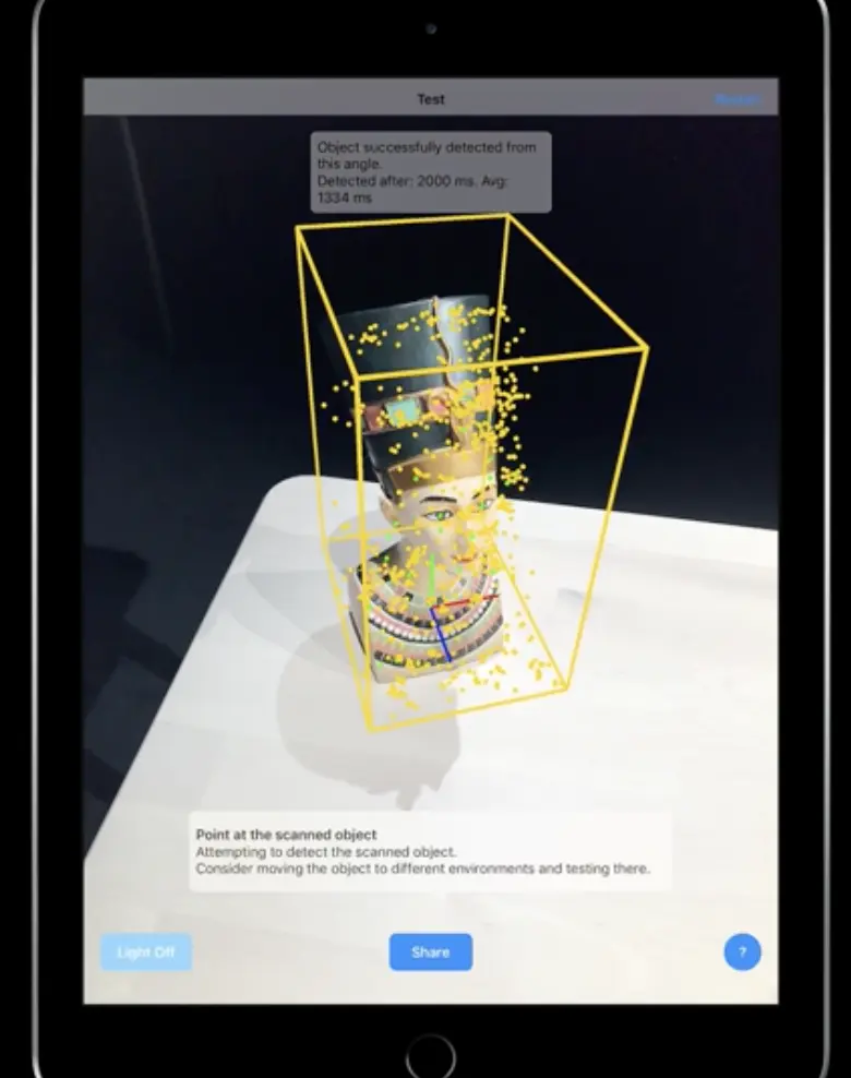 为了构建这个 app,我需要先扫描这个物体。物体扫描会收集场景中的信息,和平面检测类似,通过收集场景中的信息来估算水平面或垂直面的位置,这里则是获取有关 3D 对象的信息。