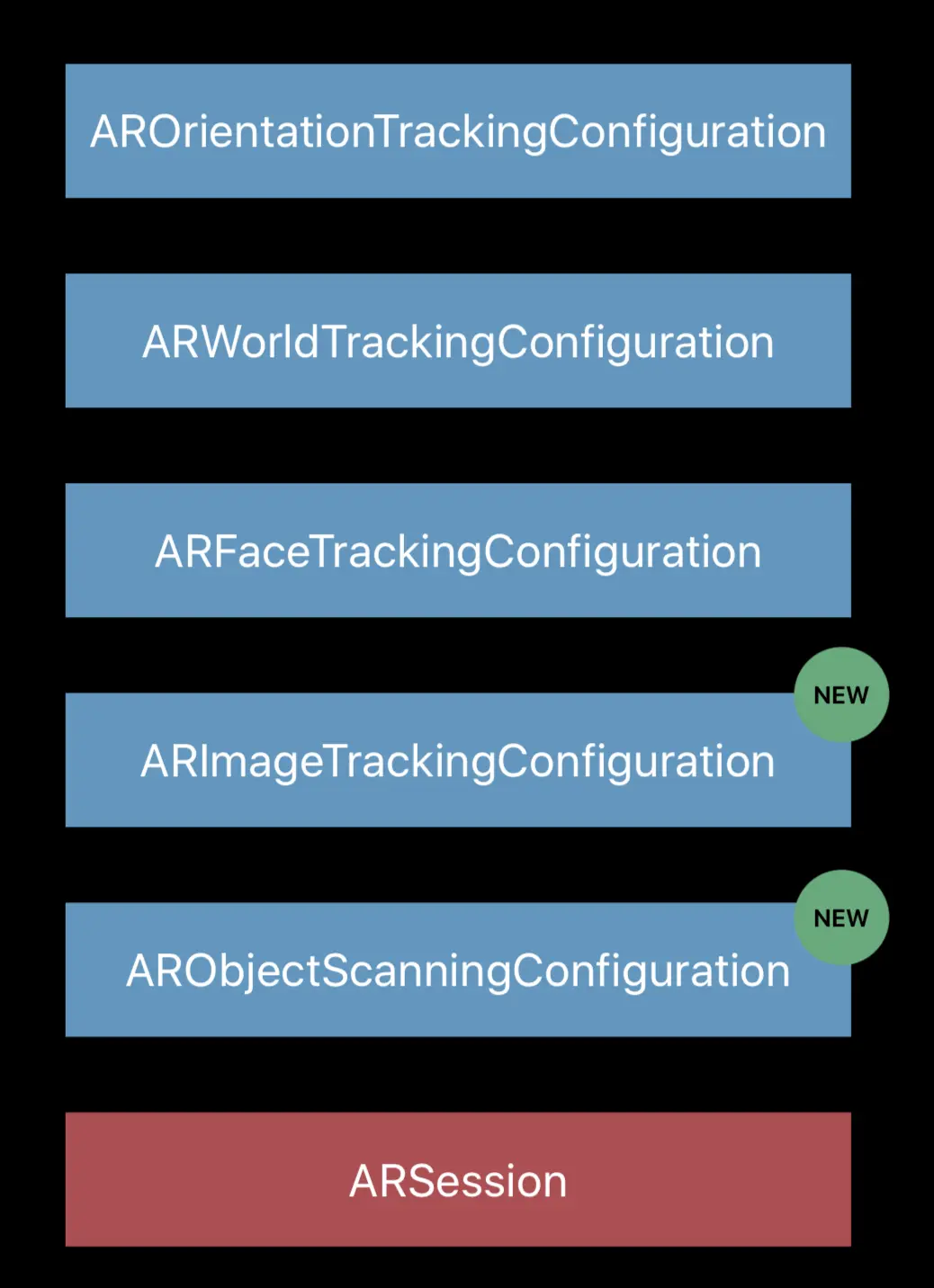 两个新增的 session configuration,ARImageTrackingConfiguration 用于独立图像追踪,ARObjectScanningConfiguration 则用于物体扫描。此外还有一些用于与 ARSession 交互的补充类型: