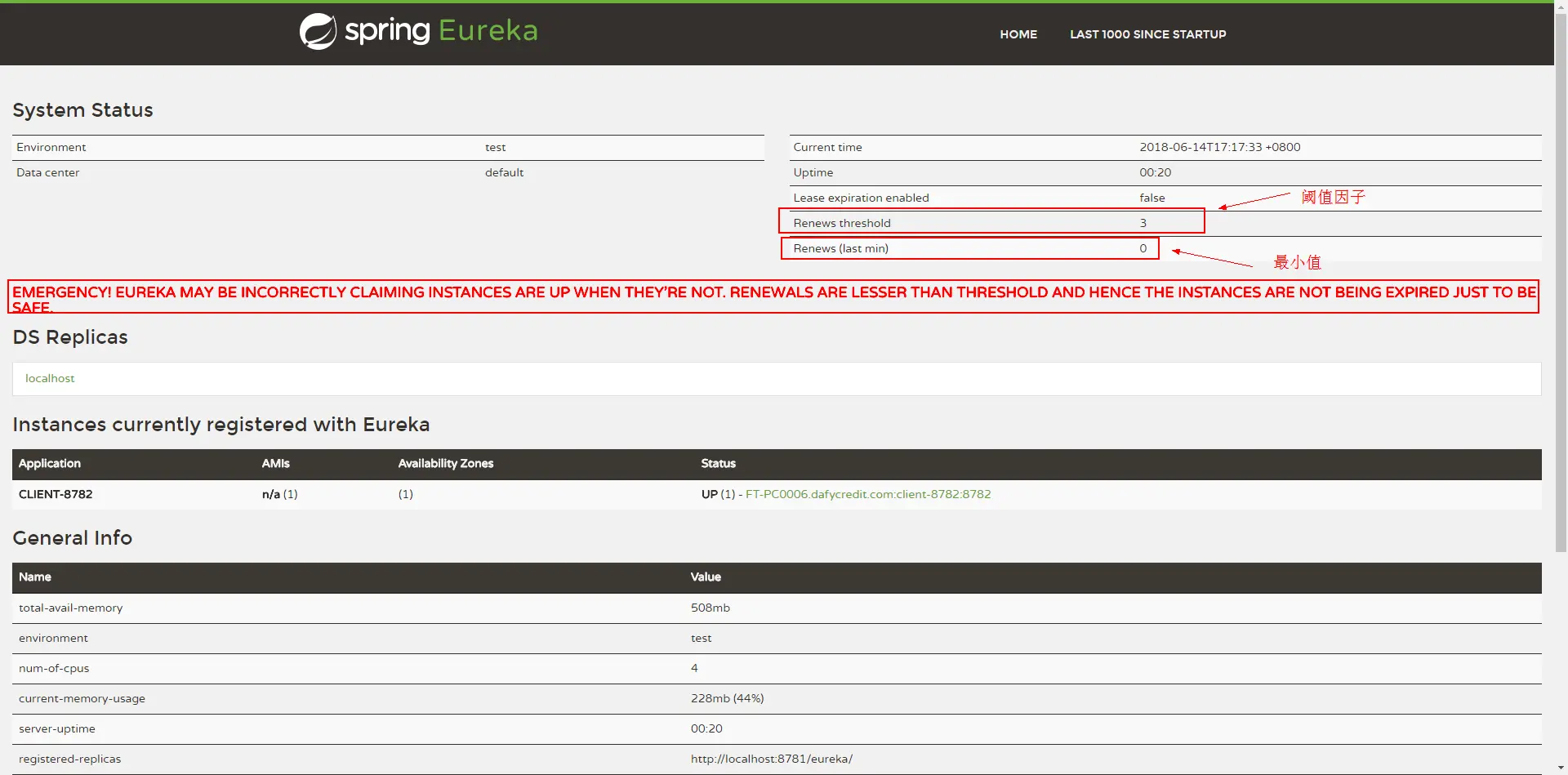 当我将客户端关闭后,再次打开Eureka的注册页面,发现有一串红字: