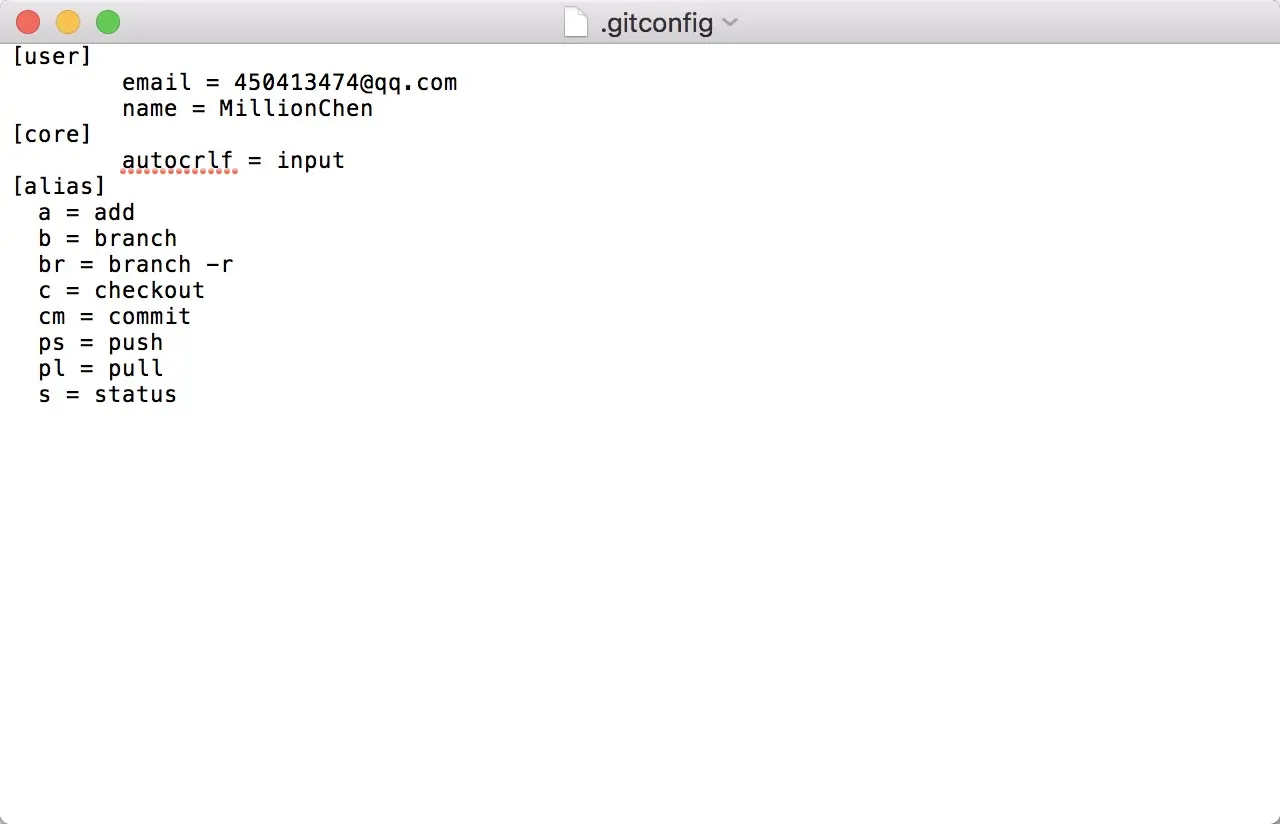 # mac本 git 起别名 MillionChen 2018-06-15 467 阅读1分钟 简单易懂步骤如下 如图配置一下代码 [alias] a = add b = branch br = branch -r c = checkout cm = commit ps = push pl = pull s = status 前面就是自己起得别名(例如a,b,br,c,cm,ps,pl,s) 大功告成 试试自己配置的别名呗