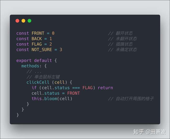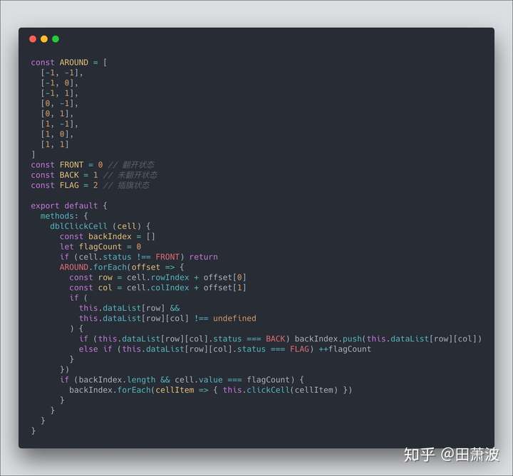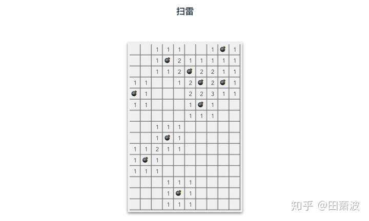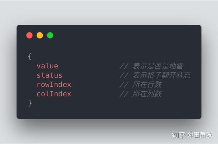 我们仍然用一个二维数组来表示雷区,但其中每个元素不再是一个 `number`,而是一个 `object`,进而存放更多关于每个格子额状态: