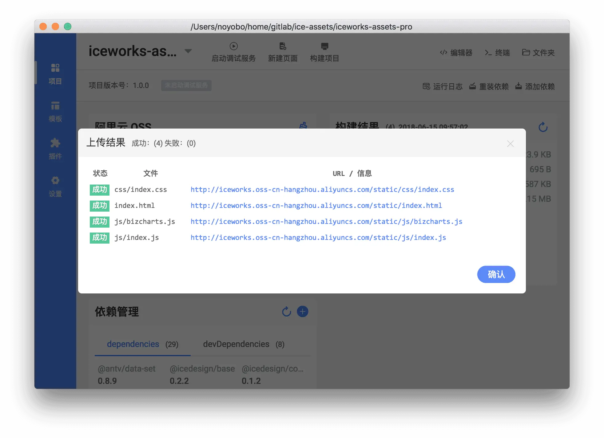 可一键将构建后的资源文件上传到阿里云 OSS 返回资源 CDN 路径,提高发布效率。