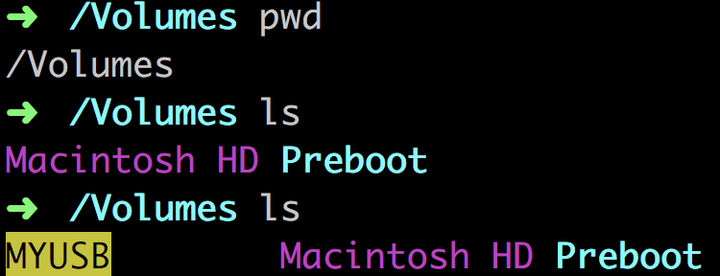 首先我们打开电脑终端,进入/Volumes目录,这时候插入U盘,可以发现它被挂载在了这个目录之下,也就是说,我们只要在固定时间扫描这个目录,当这个目录有新文件夹出现的时候,很可能有U盘被插入了。