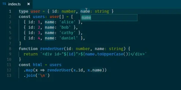 同样在第 11 行可以注意到,在键入 x. 之后,编辑器已经给出了提示:x 有两个属性 id和 name。精确的自动补全功能,是类型系统带来的额外便利。