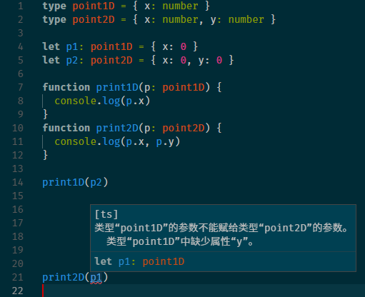 考虑以下代码。 point2D 可以被当做 point1D 来处理,反之不行。我们说 point1D 类型兼容 point2D。