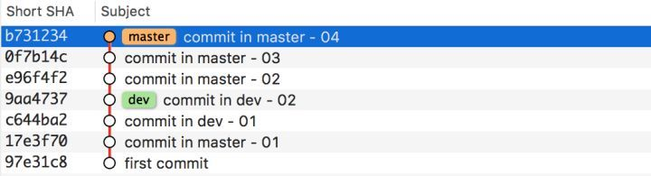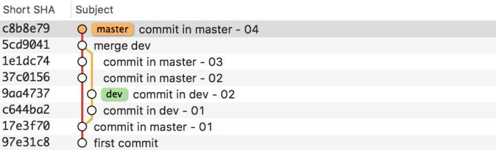 (2)使用 git rebase 合并分支,解决完冲突,执行 add 和 git rebase —continue,不会产生额外的 commit。这样 master 分支上不会有无意义的 commit。如下图: