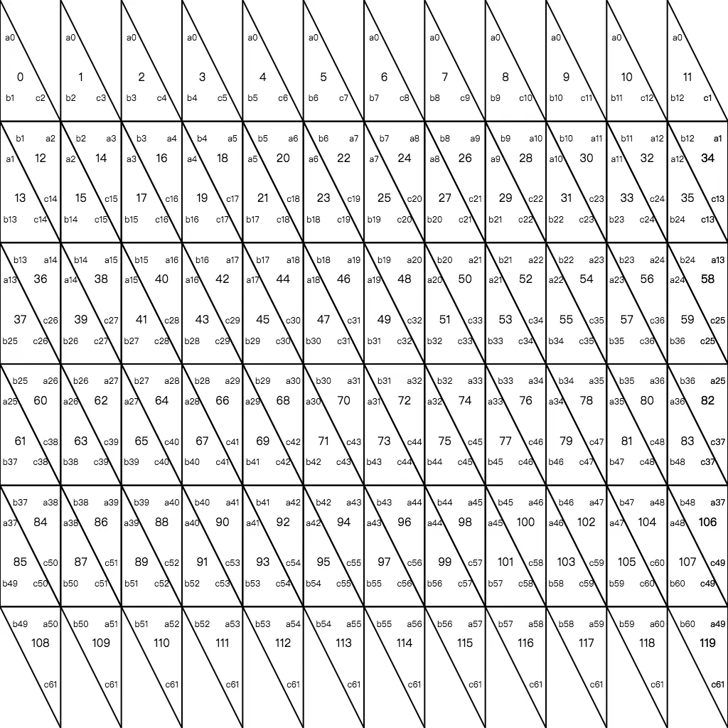 * 最后一行的话就是上一行的4个三角面使用上半部分,当前行的2个三角面使用下半部分