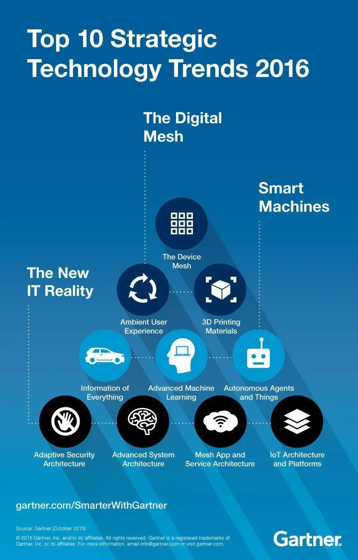 美国一家著名的从事信息技术研究和提供咨询服务的Gartner公司,在2015年提出了未来IT技术的十大发展趋势。Gartner公司副总裁,David Cearley,在2015年美国Orlando召开的ITxpo专题研讨会上,将这十大发展趋势分为三类: