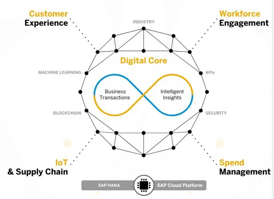 SAP于2015年2月推出了旗舰级产品S/4HANA,扮演了企业数字化核心(Digital Core)的角色。作为SAP第四代ERP产品,S/4HANA运行于基于内存计算的SAP HANA数据库上,除了保留第三代ERP产品R/3的功能并在此基础上做了增强,使得传统的OLTP事务处理和OLAP报表处理能在同一系统进行之外,借助这篇文章要聊的SAP云平台,上述提到的数字化转型的三大技术需求均能得到满足。简而言之,通过S/4HANA + SAP云平台,数字化转型的目标:人,机器和业务的三者互联得以实现。