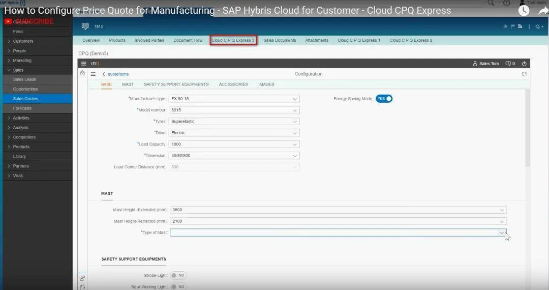 又如另一家叫In Mind Cloud的新加坡Partner,开发了一款CPQ(Configure, Price, Quotation)的增强解决方案,通过C4C mashup技术嵌入到C4C标准UI的一个标签页上,如下图所示。