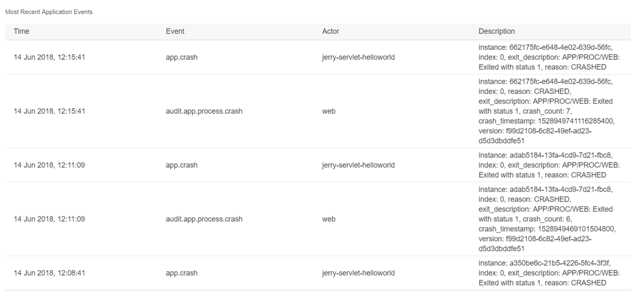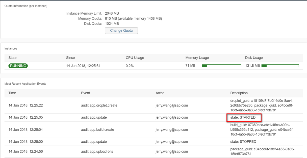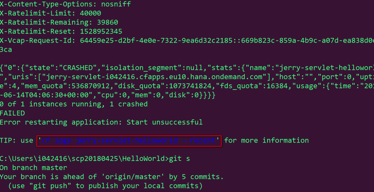Netweaver和CloudFoundry的服务器日志 已注销 2018-06-17 135 阅读1分钟 Netweaver 事务码SMICM,Goto->HTTP Plug-In->Server Logs: CloudFoundry 假设我部署本地应用到CloudFoundry之后,应用的状态变为CRASHED。然而从应用的控制台看不出太多有用的信息。 此时可以使用命令cf logs --recent来查看服务器端日志: 从返回的日志我们能清楚看到应用部署后CRASH的原因为manifest.yml里为应用分配的512M不够大。 把该数字调大后错误即解决。 要获取更多Jerry的原创技术文章,请关注公众号"汪子熙"或者扫描下面二维码: