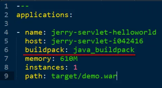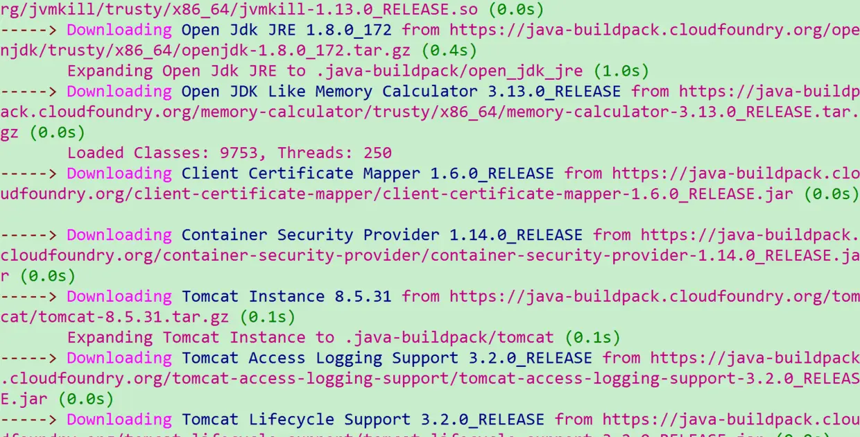 假设我本地开发了一个Java Web应用,里面包含一个Servlet,部署到CloudFoundry后,该应用如何运行起来的? 细心观察cf push的日志,不难自己找出答案。 因为我的manifest.yml里定义的buildpack为java_buildpack: