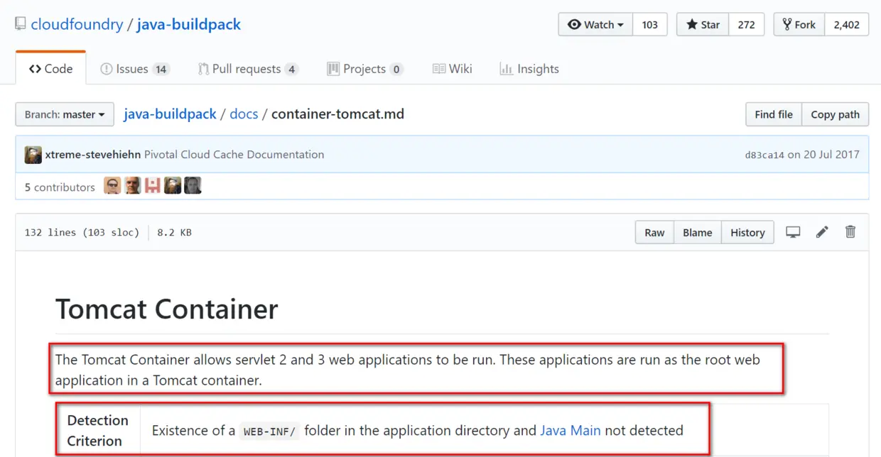 一旦buildpack检测到war包中存在WEB-INF,且不存在Java Main(实现了main方法的Java类),则决定使用Tomcat容器。