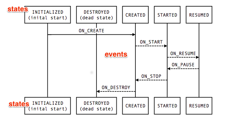 static class ObserverWithState { State mState; GenericLifecycleObserver mLifecycleObserver; ObserverWithState(LifecycleObserver observer, State initialState) { mLifecycleObserver = Lifecycling.getCallback(observer); mState = initialState; } void dispatchEvent(LifecycleOwner owner, Event event) { State newState = getStateAfter(event); mState = min(mState, newState); mLifecycleObserver.onStateChanged(owner, event); mState = newState; }} |