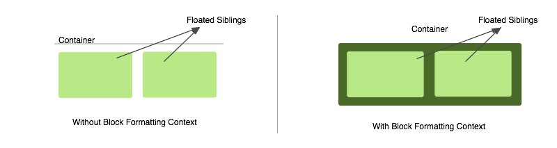 当container内部有float元素时,container本身没有高度,里面的子元素也会脱离文档流,为了避免这个情况,可以用BFC,根据BFC规范中的第4条:计算BFC的高度时,浮动元素也参与计算,那么外部div容器就可以包裹着浮动元素