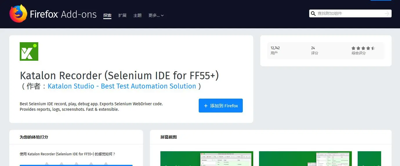 因为selenium在火狐浏览器里,可以自动化录制脚本,我们通过脚本录制可以生成出不同的语言脚本,可以省去我们90%的编写脚本工作量。 可以安装最新版的火狐浏览器,然后安装Katalon Recorder (Selenium IDE for Firefox) 使用火狐浏览器打开https://addons.mozilla.org/zh-CN/firefox/addon/katalon-automation-record/?src=search