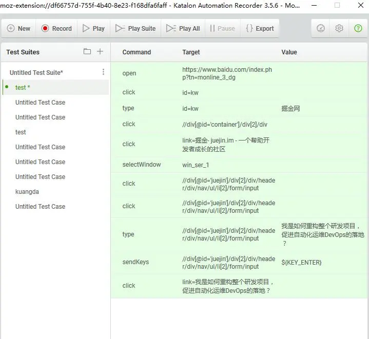 录制后,我们点击一下play,可以看到火狐浏览器自动化的完成了我们刚刚的操作(关闭弹窗阻止,或者将掘金和百度加入不阻止弹窗列表)