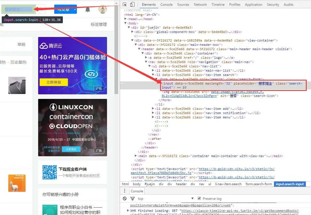 <input data-v-5ce25e66="" maxlength="32" placeholder="搜索掘金" class="search-input">