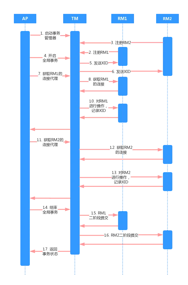 AP通过从TM中获取的连接,间接操作RM进行业务操作。TM在每次AP操作时把XID传递给RM,RM正是通过这个XID关联来操作和事务的关系的。