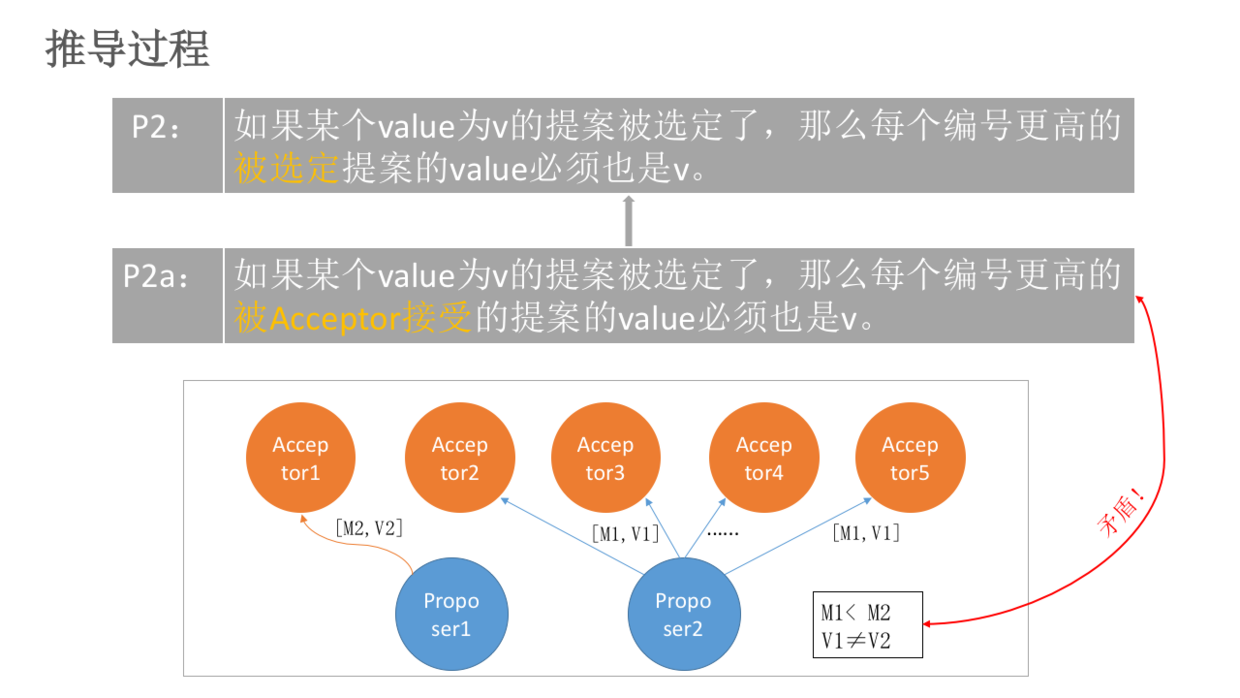 V1被选定了,但是 编号更高 的被Acceptor1接受的提案[M2,V2]的value为V2,且 V2≠V1。这就跟P2a(如果某个value为v的提案被选定了,那么每个 编号更高 的被Acceptor接受的提案的value必须也是v)矛盾了。