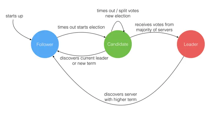 就像一个民主社会,领袖由民众投票选出。刚开始没有 领袖,所有集群中的 参与者 都是 群众,那么首先开启一轮大选。在大选期间 所有群众 都能参与竞选,这时所有群众的角色就变成了 候选人,民主投票选出领袖后就开始了这届领袖的任期,然后选举结束,所有除 领袖 的 候选人 又变回 群众角色 服从领袖领导。