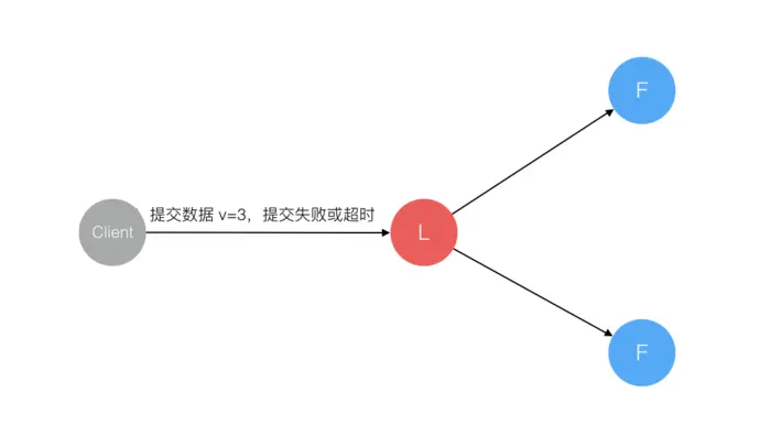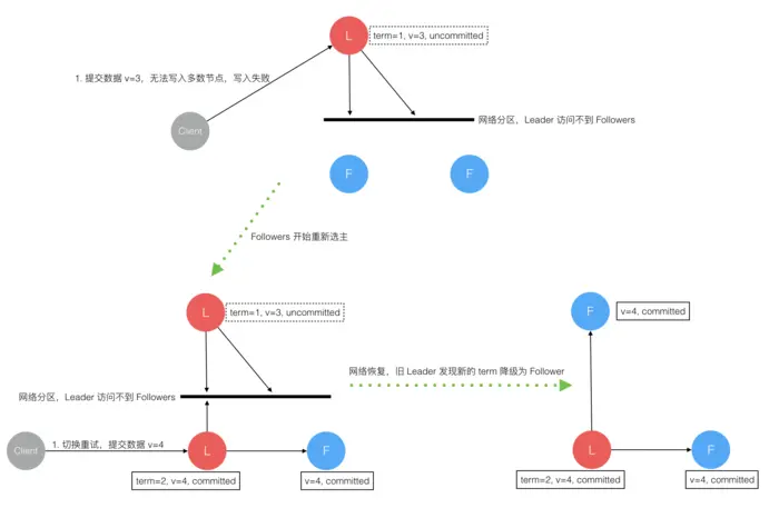 Follower 节点上没有该数据,重新选主 后 Client 重试 重新提交 可成功。原来的 Leader 节点 恢复 后作为 Follower 加入集群,重新从 当前任期 的新 Leader 处 同步数据,强制保持和 Leader 数据一致。