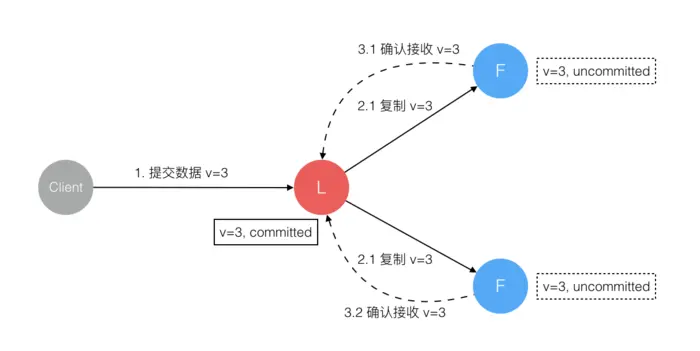 Client发出数据接收Ack响应后,表明此时 数据状态 进入 已提交(Committed),Leader节点再向Follower节点发通知告知该 数据状态已提交。