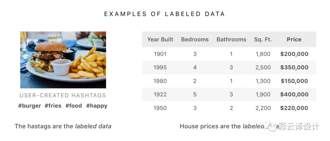 监督学习允许我们使用正确标记的数据进行预测。标记数据是一组具有信息标签或输出的示例。例如,带有相关标签的照片或房屋特征(卧室的数量、位置)和价格。