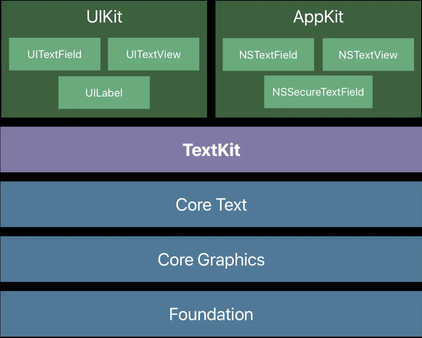 和平时使用的框架有些不同,我们不需要使用 import 关键字来导入 TextKit。包含 UILabel、UITextField 等控件的 UIKit 框架(用于 iOS),以及包含 NSTextView 等控件的 AppKit 框架(用于 Mac OS),都是基于 TextKit 构建。在使用上面的文本控件时,其实就是在使用 TextKit,它协同 Core Text、Core Graphics 以及 Foundation,一起为我们的 app 提供强大的文本展示能力。