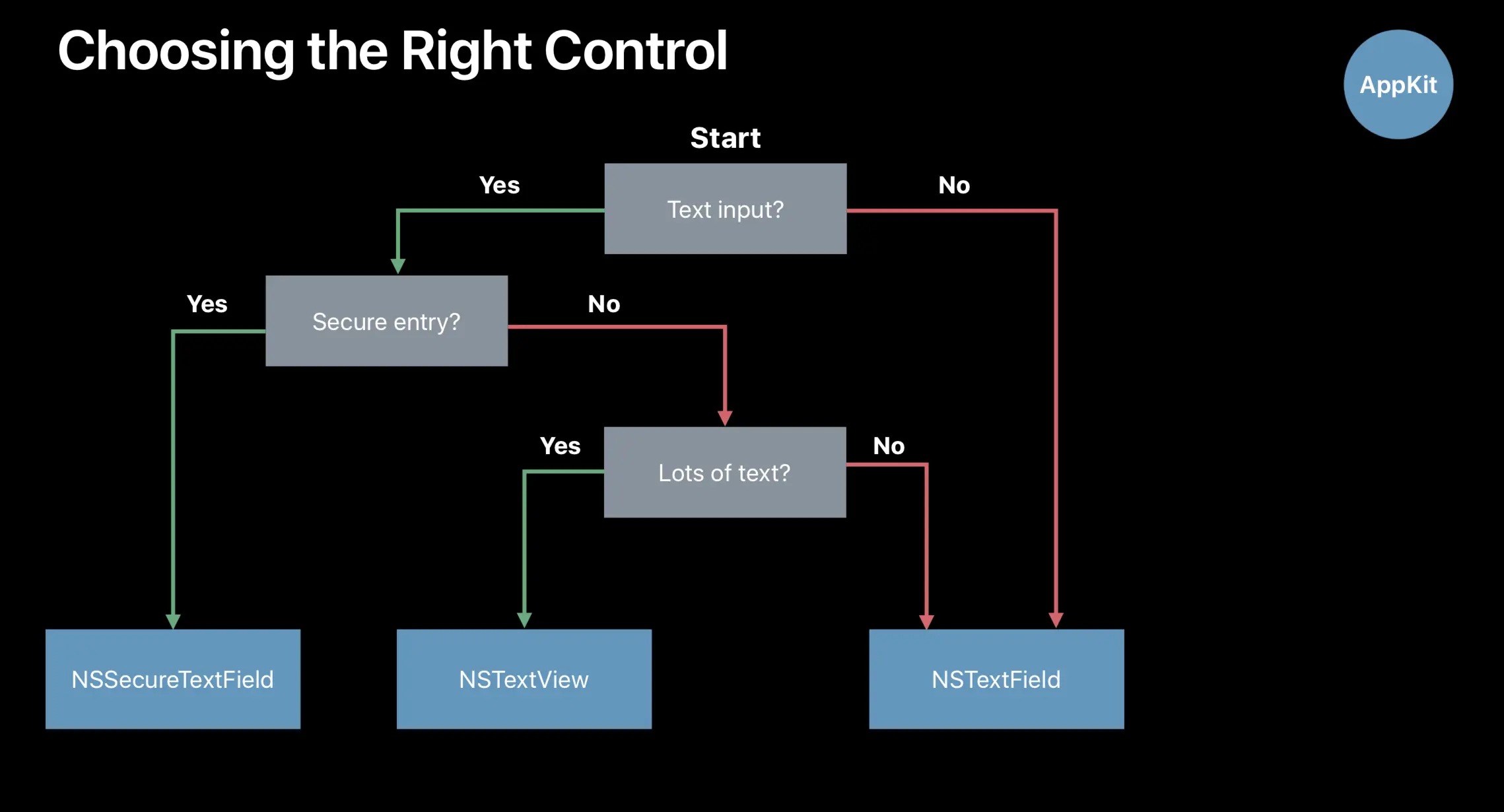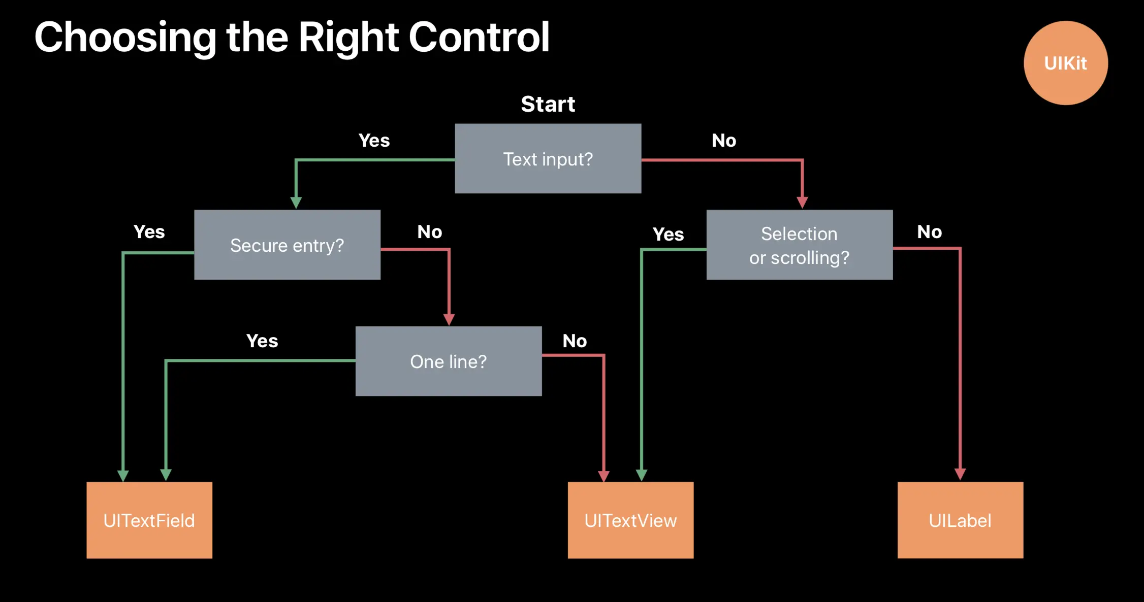 对于不同类型的文本,我们需要选择合适的文本控件。那么该如何决定呢?苹果为我们提供了比较明确的指导,如下图所示。在使用 UIKit 和 AppKit 时,情形会稍有不同,所以分开进行描述。