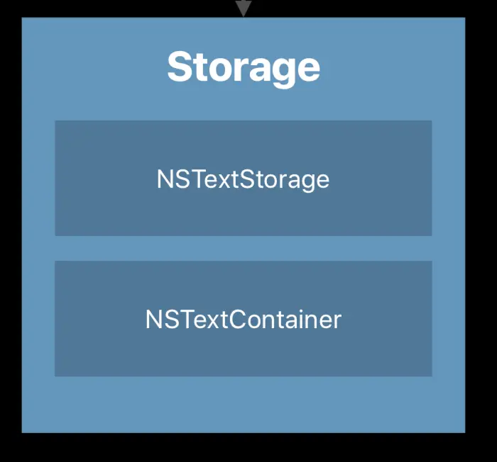 深入了解一下各个部分的组成,首先是与 Model 层通信的 Storage 模块,它包含的 NSTextStorage 持有字符串的数据和属性信息。值得注意的是,它是MutableAttributedString 的子类,因此使用方式和我们熟知的 AttributedString 一致。而 NSTextContainer 则负责模型化文本布局的地理位置、区域信息。