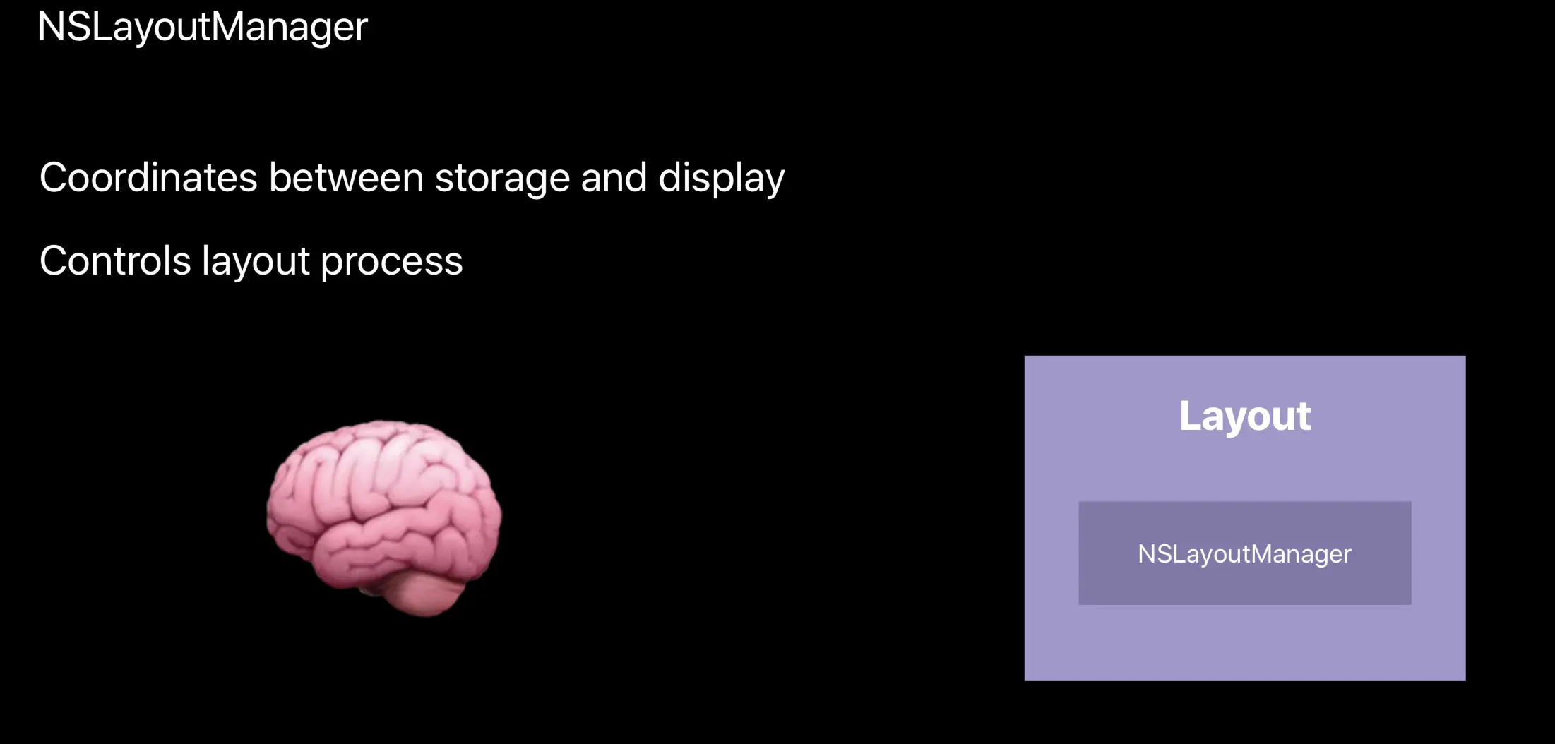 最后是 Layout 模块,它和 Controller 层进行通信。 NSLayoutManager 是这个模块唯一的组成部分。它的强大让苹果用“野兽”来形容。它是整个展示过程的“大脑”,控制自己的布局过程。