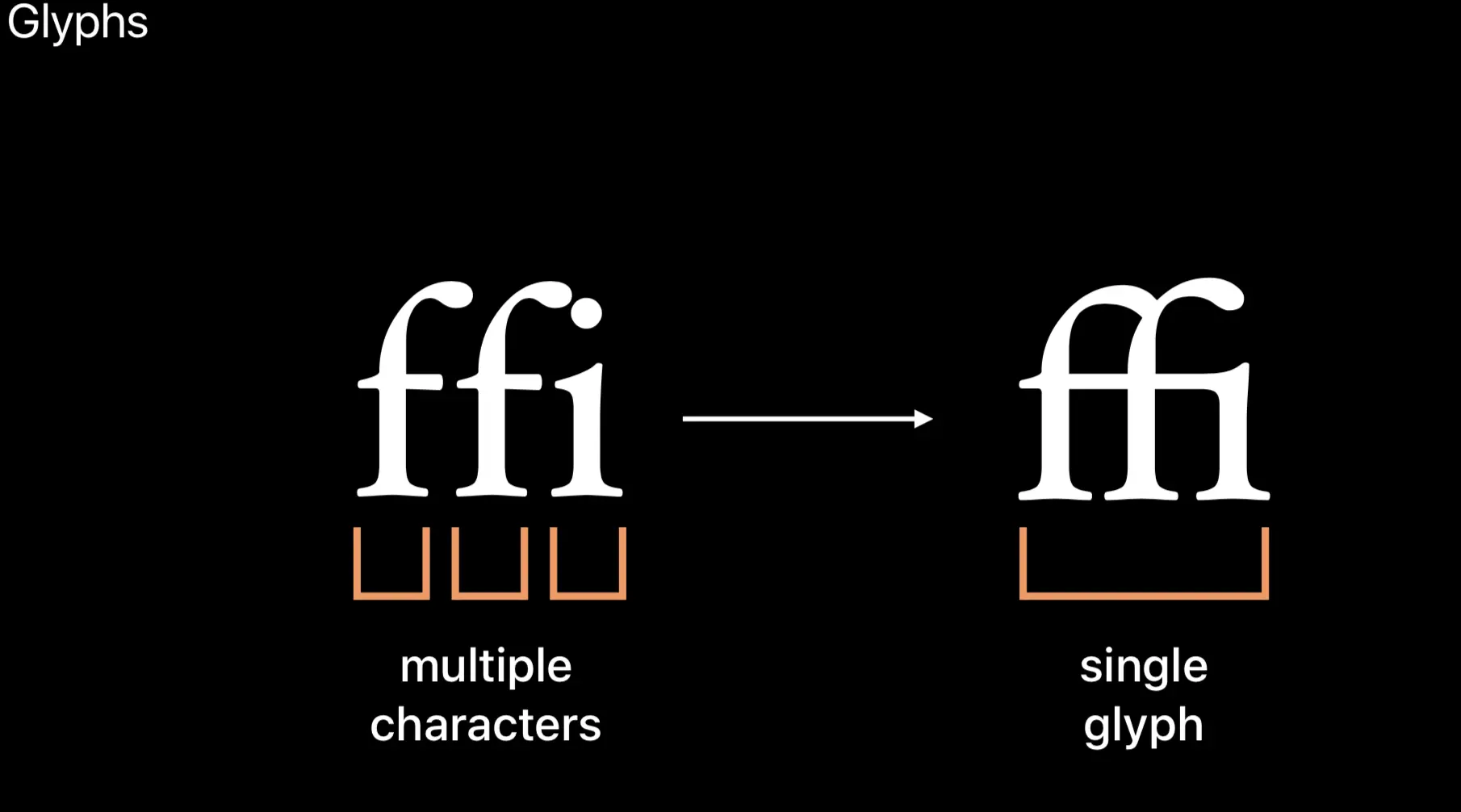 可以看到,character 和 glyph 的对应关系不总是一对一的。图中的字符串 “ffi” 由三个字符组成,但整个字符串可以由一个 glyph 表示。再看下图的例子,一个单独的字符 “n”,也可以由两个 glyph 来表示。