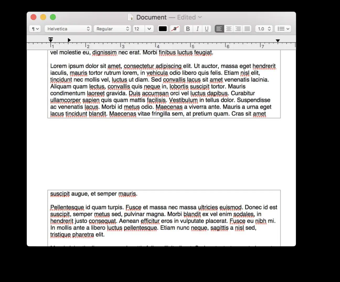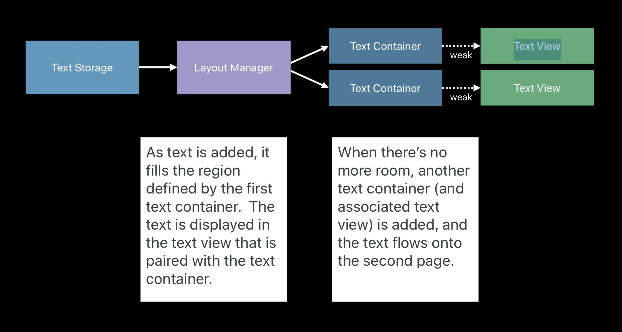 文本内容被添加之后,它铺满由第一个 text container 定义的区域。文本在 text view 上和 text container 成对展示。 当没有剩余空间时,新的 container 连同 text view 一起被添加,并且文本在第二个页面或者文本行进行展示。