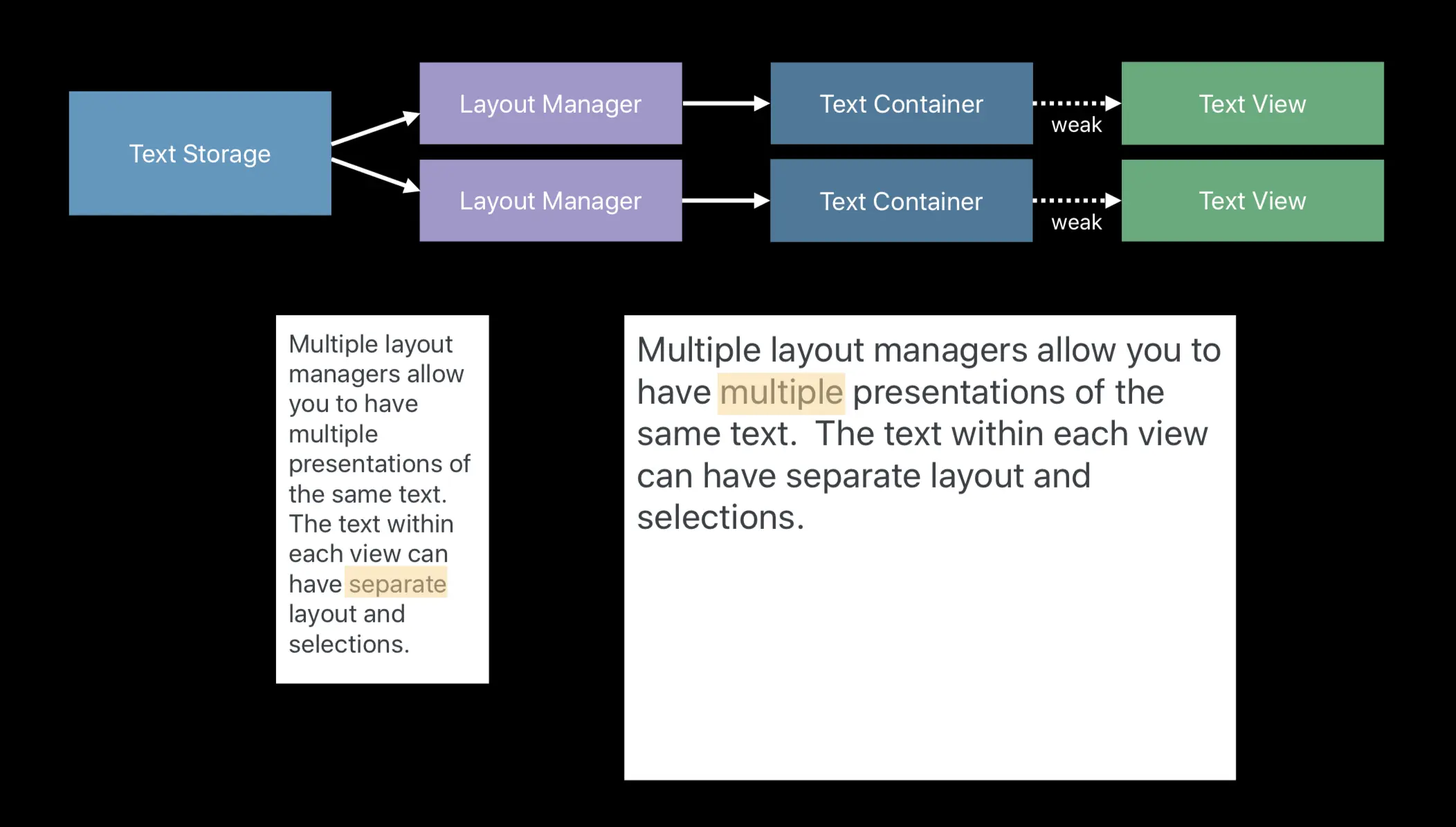 多个 layout manager 允许你对同样的文本有多种不同的显示效果。这个文本在不同的视图上可以有彼此不同且独立的布局和分组,下图是这种模式下的结构示意和效果示意。方框内的文本内容相同,但展示效果是不同的。