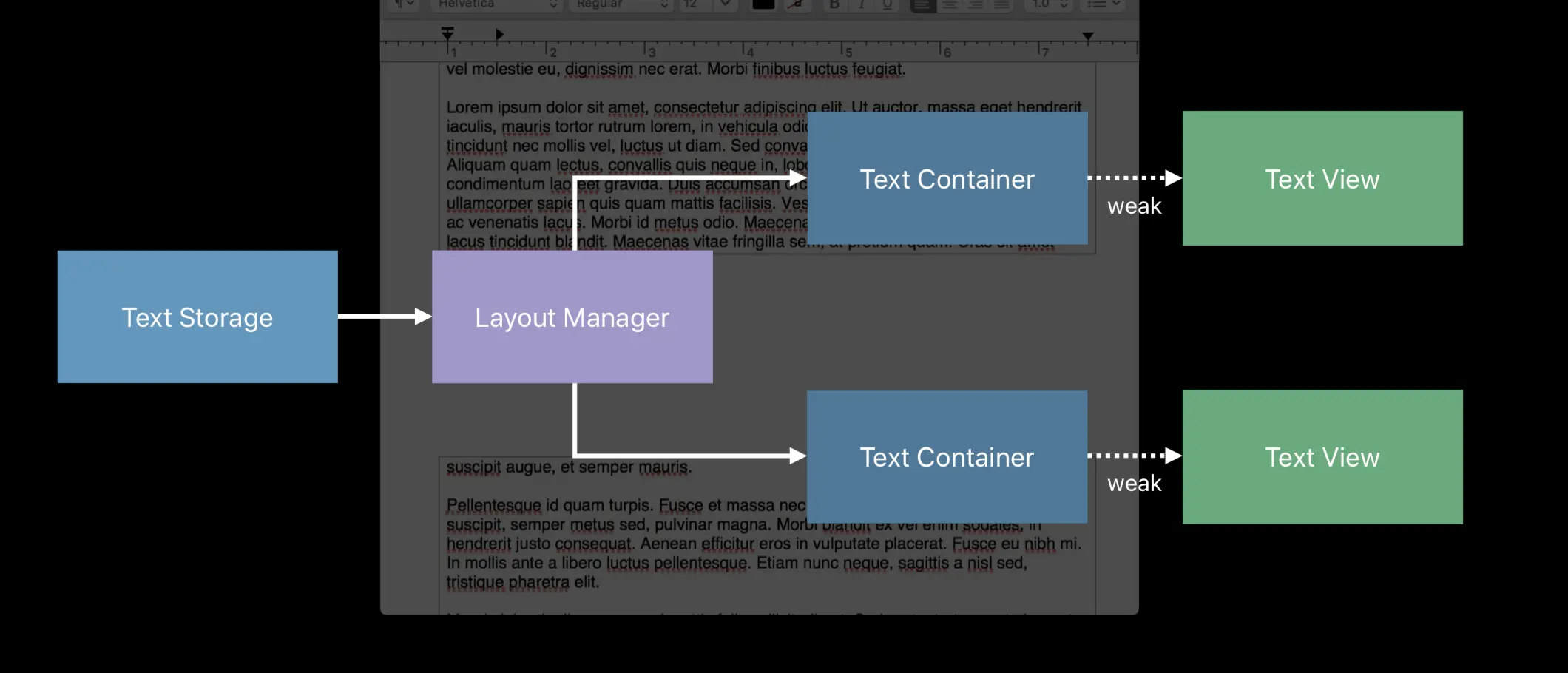 TextEdit 这个 app 支持富文本的展示、编辑,文本编辑部分的特性很像一个 textview,自然,它符合前面讲述的标准配置结构。值得注意的是,文本编辑部分支持分页展示,可以看到页面下滑时,textcontainer 被重新设置了尺寸,文本从第一页跳到了第二页。很自然,这是使用了多个 textcontainer 的 textview,但是依然由同一个 textstorge、layoutmanager 管理,他们允许文本自由地从一个 textcontainer 跳到另一个。下图即是它的配置结构图: