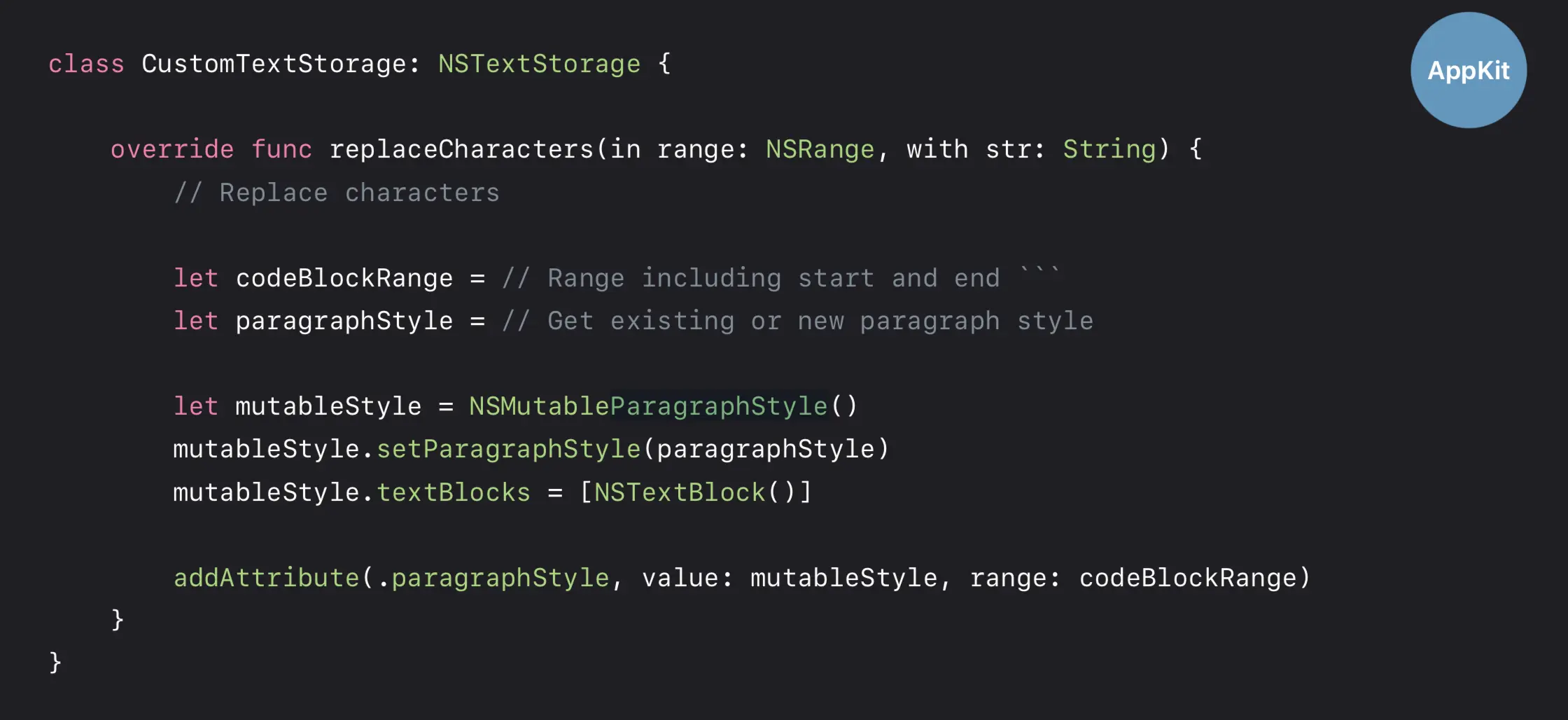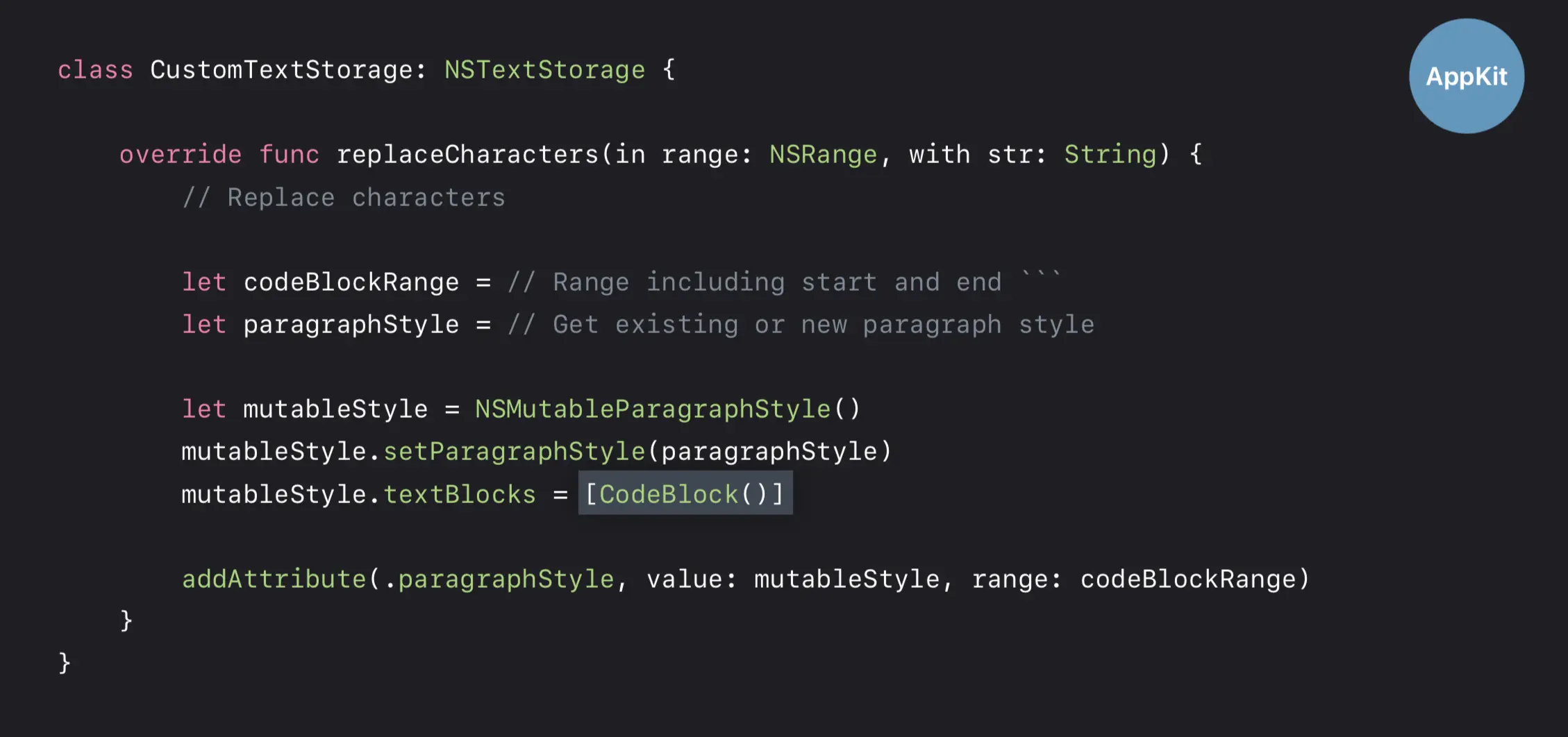 子类继承 NSTextStorage ,实现四个强制实现的方法,特别是 replaceCharacters(in:with:) 方法。内部实现是将 NSTextBlock 赋值给 ParagraphStyle 然后把这个 ParagraphStyle 作为一个 attribute 添加到一个 NSTextStorage 中,注意对应的范围是代码块文本。