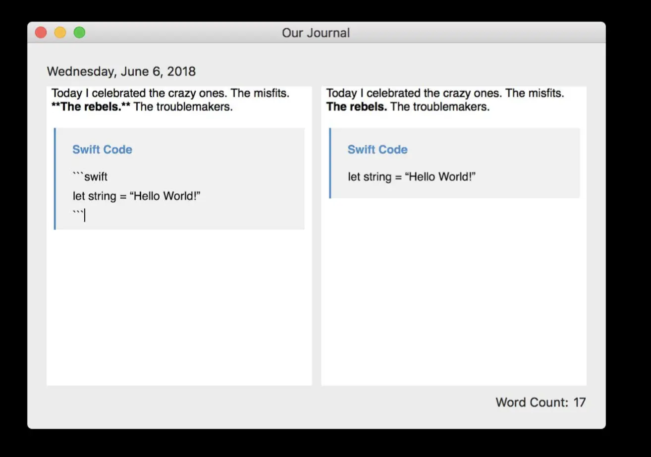 粗体标记完美实现了。那么如何展示一个代码片段呢?像图中所示,完成键入最后一个点符号,就可以生成一个代码块文本,同时还会被标示为 Swift 代码。对于这样一个复杂的情形,我们需要两把工具: