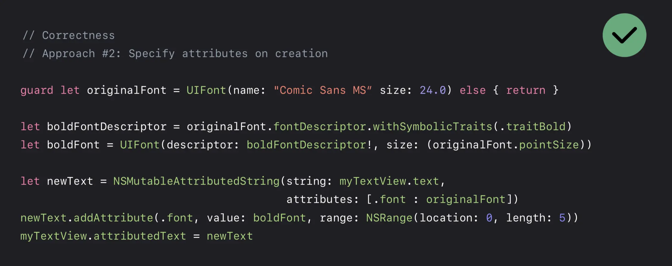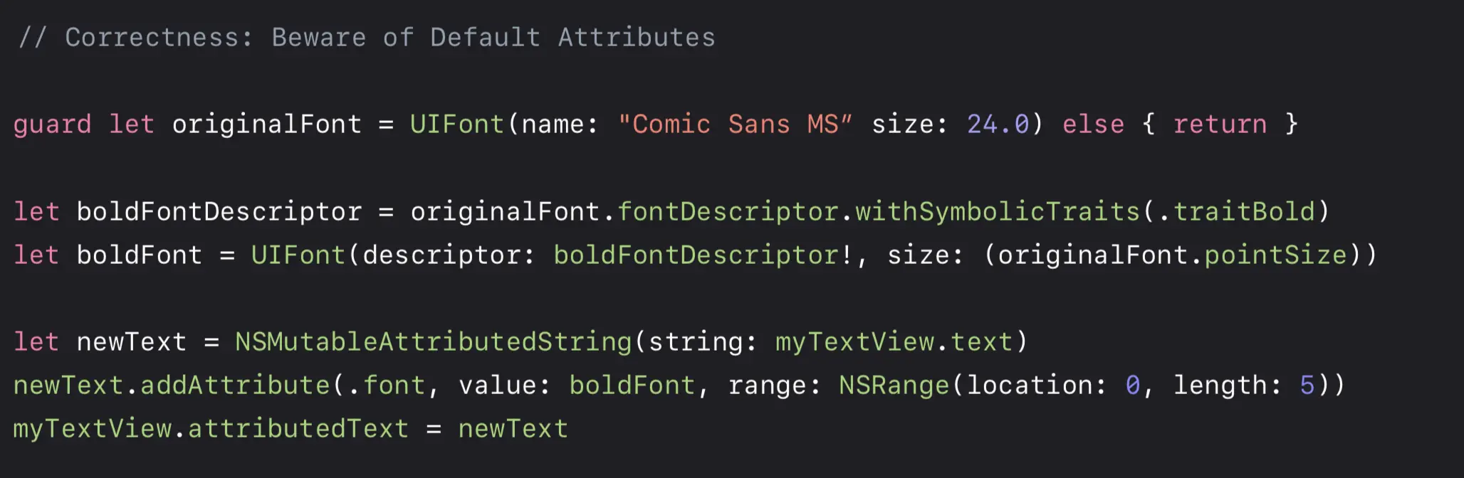 我们有两种方式来解决这件事。一种是避免将整个文本同时进行设置,而是对于 don‘t 设置粗体,对于 hate 设置 Comic Sans MS,但这样比较繁琐。所以另一种是初始化 AttributedString 时,附带原有字体的参数,然后对 don‘t 部分再行设置。