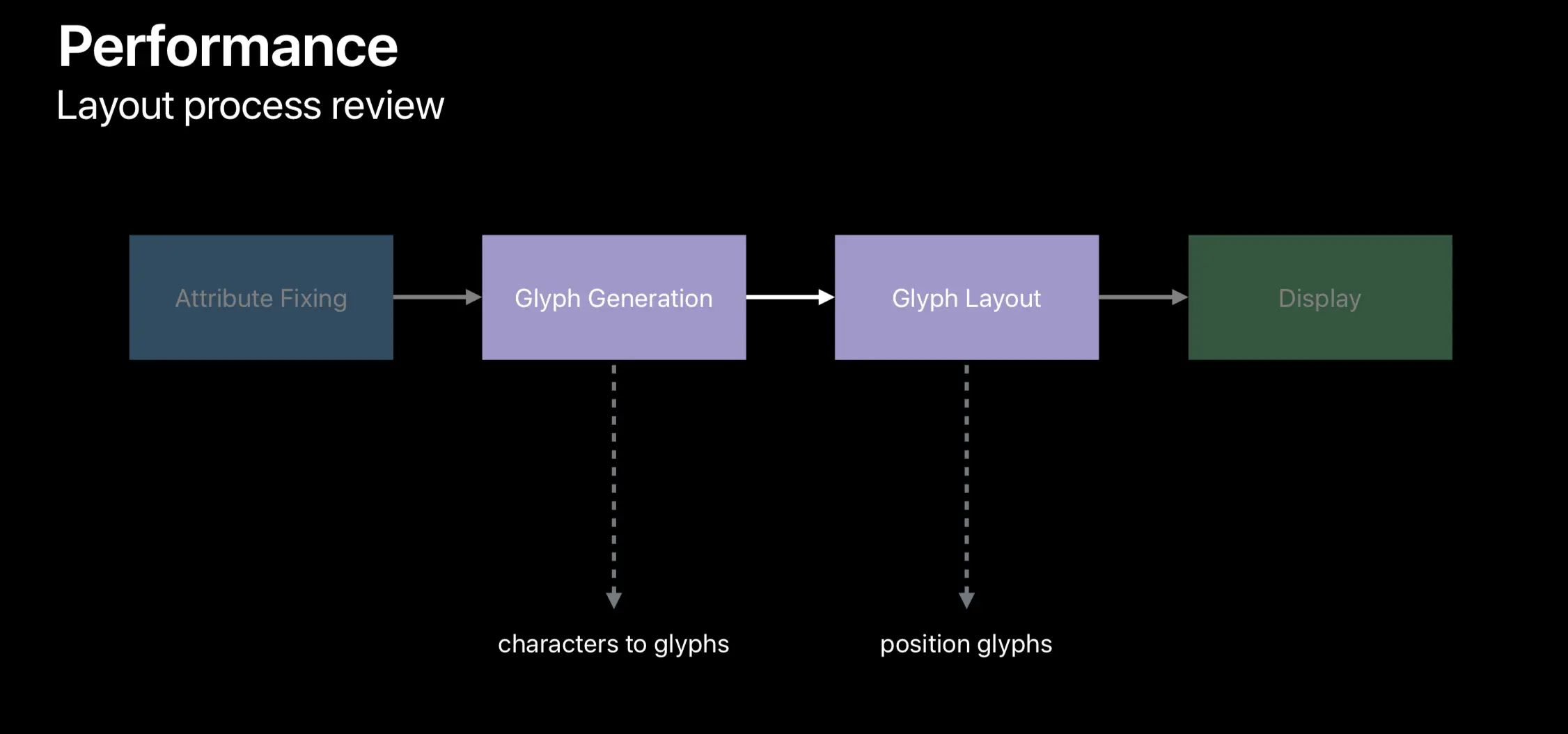 再回到布局过程的图示中来,glyph 布局,就是 NSLayoutManager 在视图上摆放 glyph 的过程。