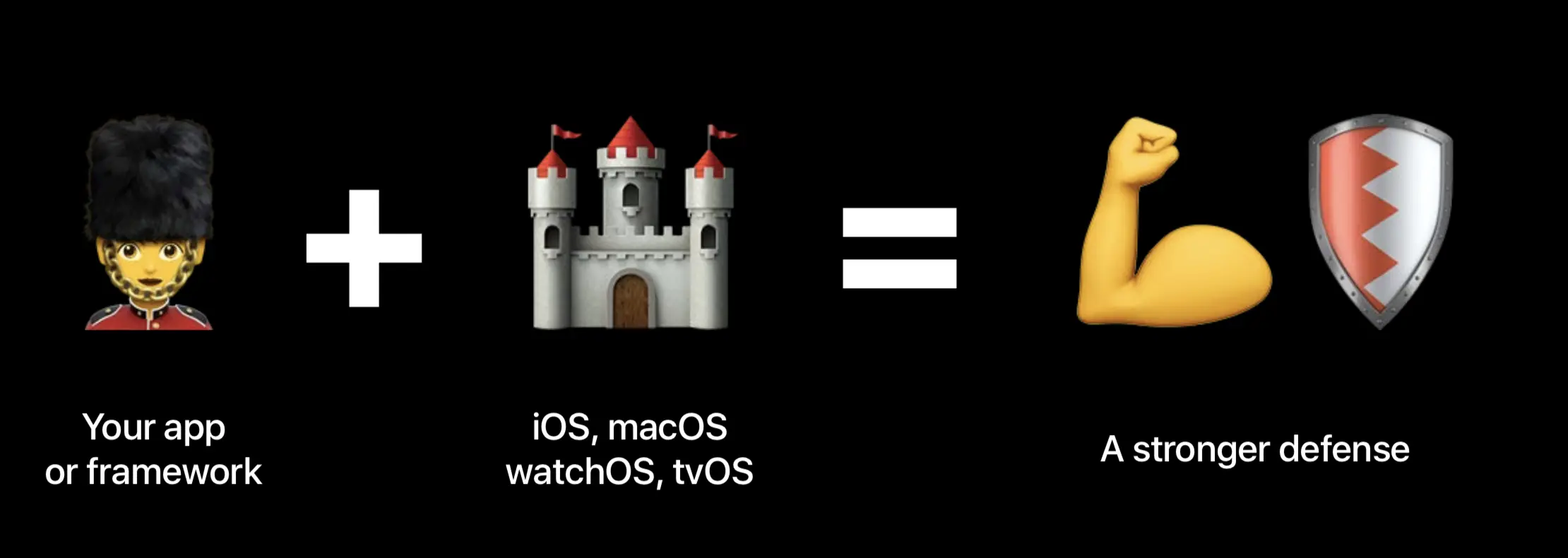 这里苹果给出了一个形象的例子:开发者就像武装的士兵,而 iOS、Mac OS 就像坚固的堡垒,士兵和堡垒共同组成了坚固的安全性防御工事。这就意味着,iOS 应用的安全性需要开发者和苹果共同协作。