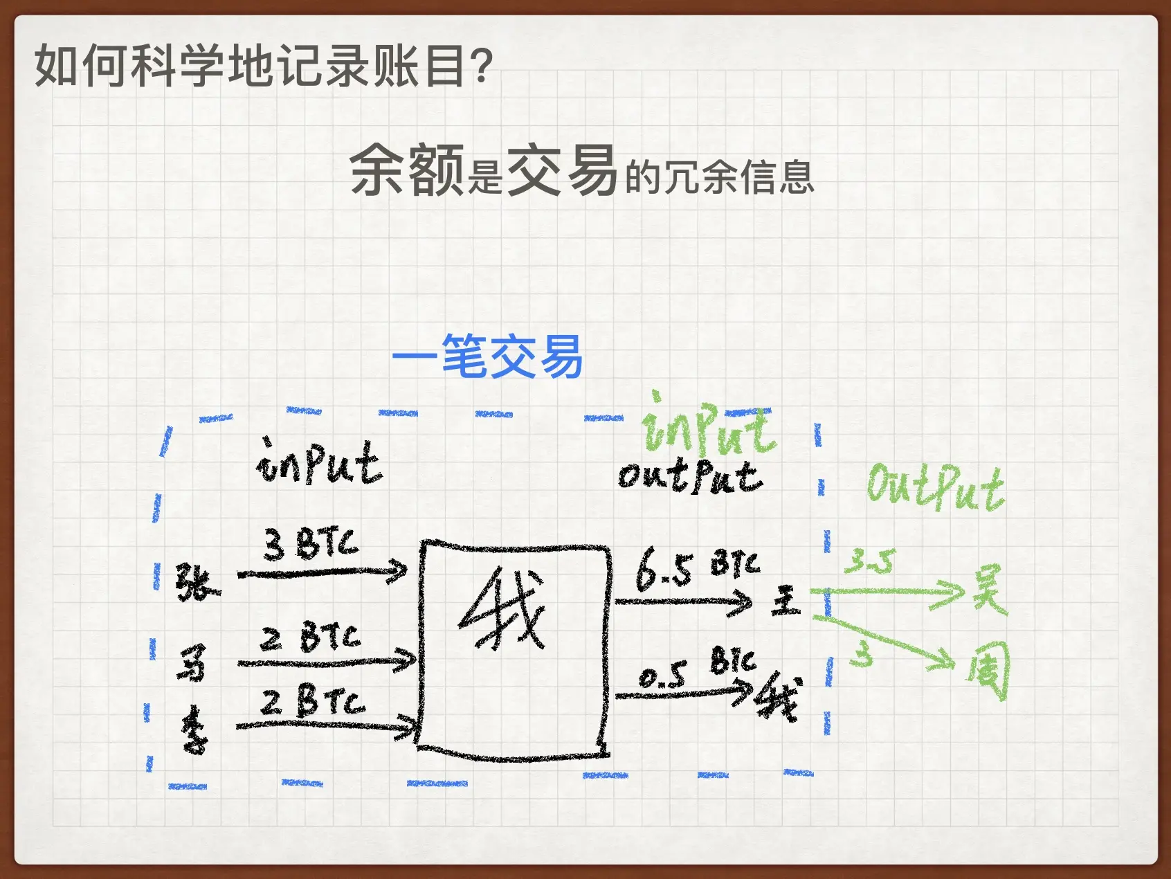 因此我们得到一个结论,我们的『分布式公共账本』记录的应该是交易记录,而不是余额,因为『余额』是『交易』的冗余信息。