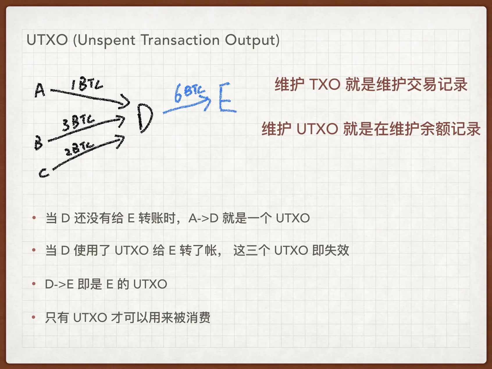 我们把没有使用过的交易记录,称为:未花费交易输出(UTXO)。比特币系统中的账本记录了历史上每一条交易记录,非常庞大。但是不用过分担心性能,虽然账本记了所有的记录,但每个节点可以自己维护一个 UTXO 的集合,每笔交易在验证的时候,只需要看看 input 是否都在 UTXO 集合中即可。