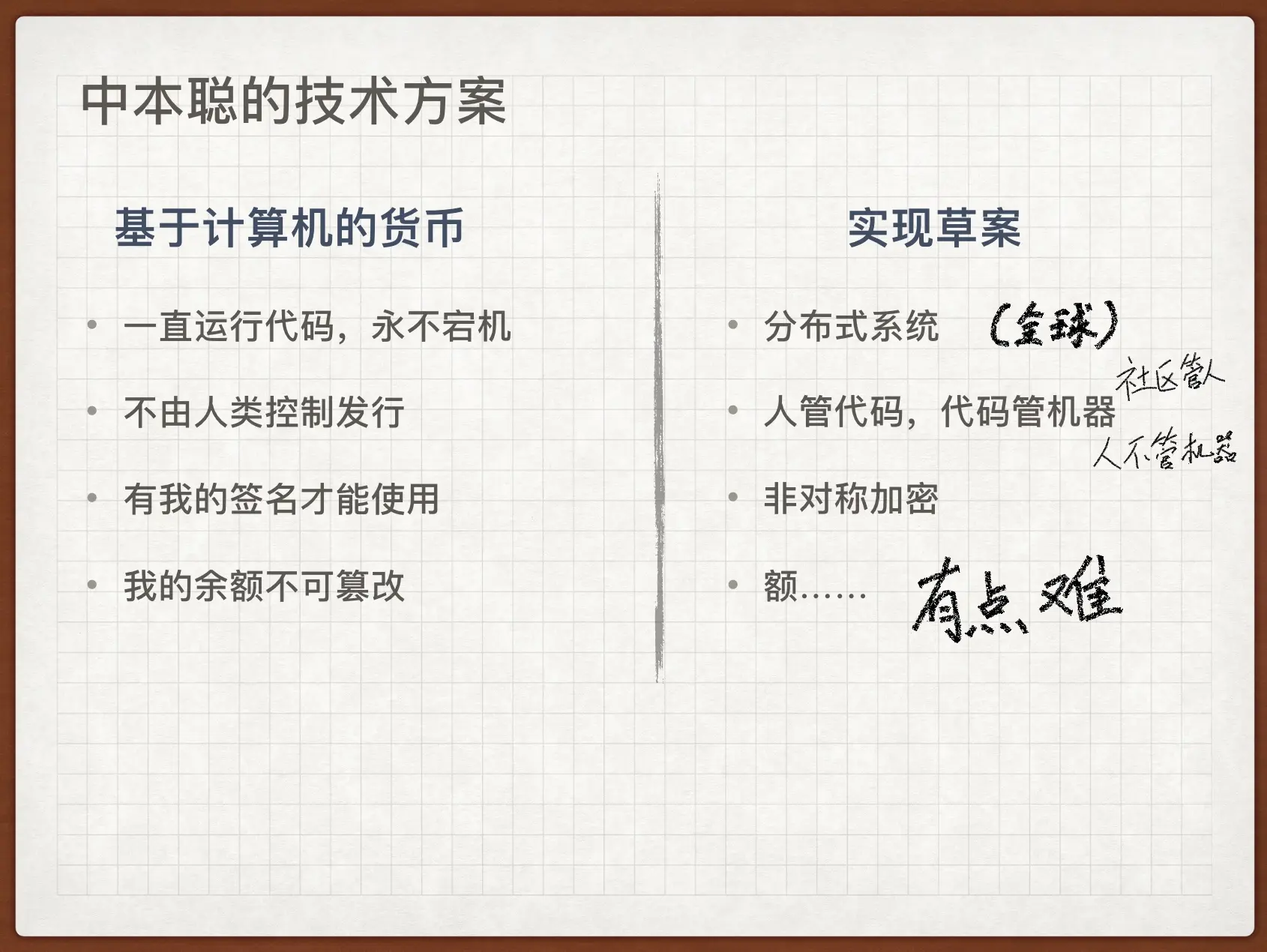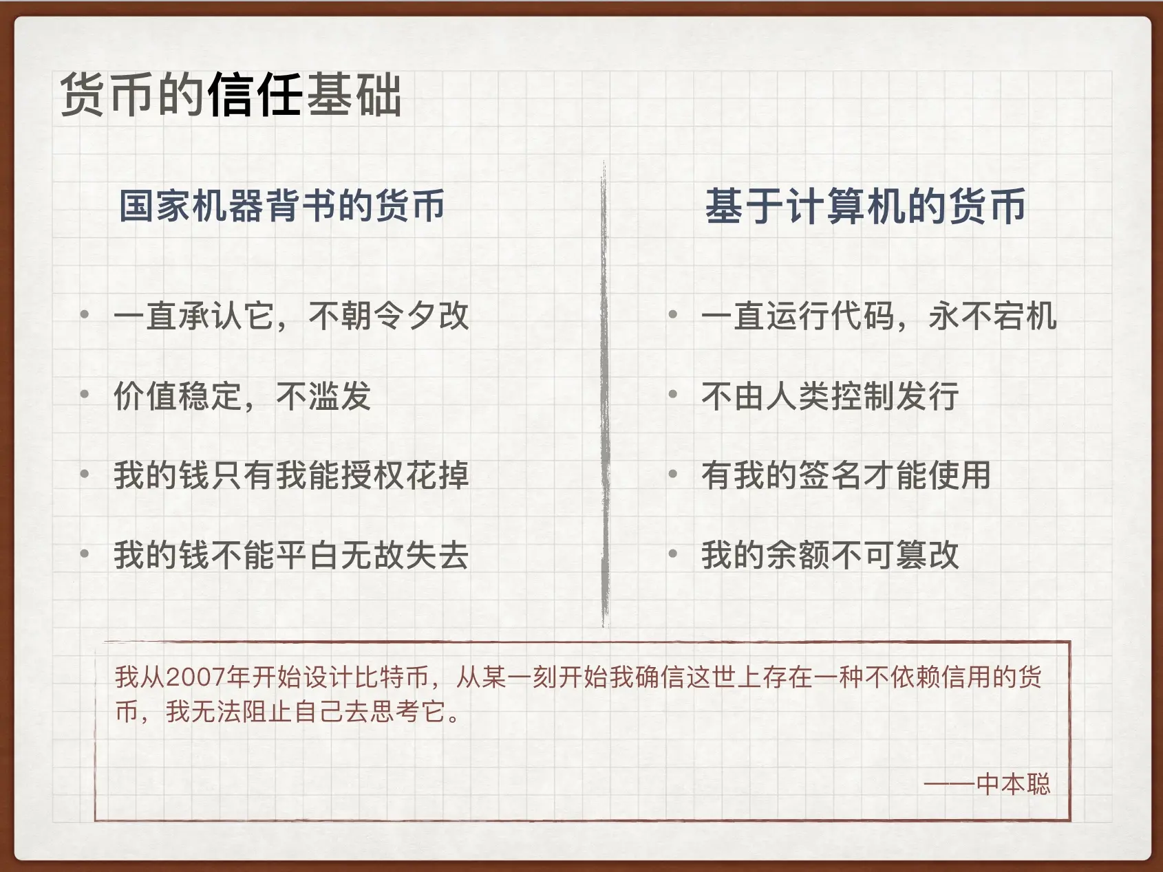 因此我们可以得出一些结论,货币需要赢得人们的信任基础。我们设想一下,如果要实现一个数字货币,对标国家机器发行的货币,应该如何获得信任基础呢?