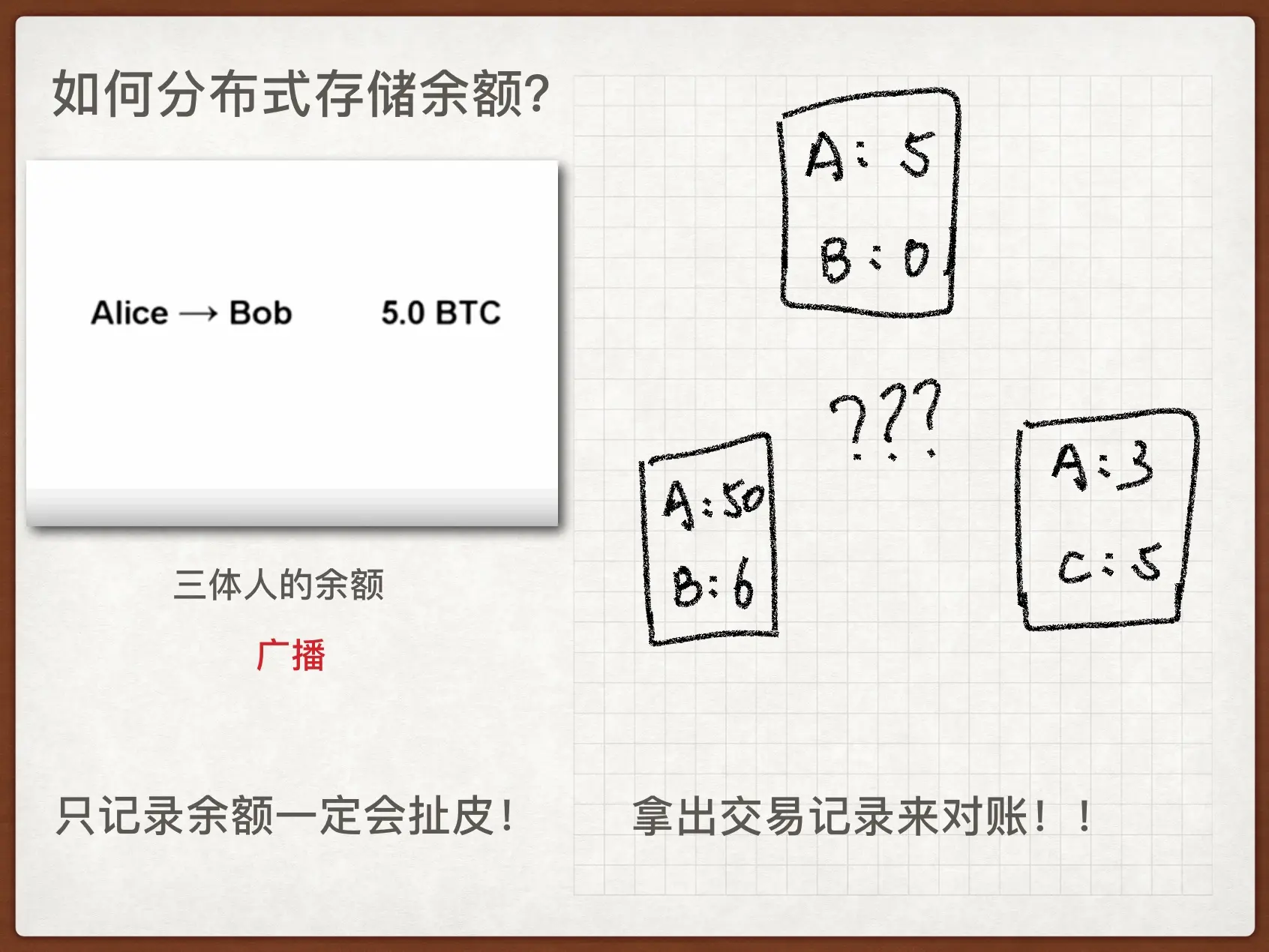 如果是中心化存储余额,像各大银行那样,维护每个人的余额信息是很容易的。但是分布式存储余额,相当于每个人手里都有一本帐,当发生交易的时候,我们可以把交易的消息广播(消息的网络广播原理 p2p 技术已经发展很多年了,不再展开解释)给其他所有人,让其他人都改变自己手里的账本。这就有点像三体人的账本,假如每个人都不会欺骗撒谎,自觉做余额的加加减减,那么每个人的账本都将准确地记录了每个人的余额。