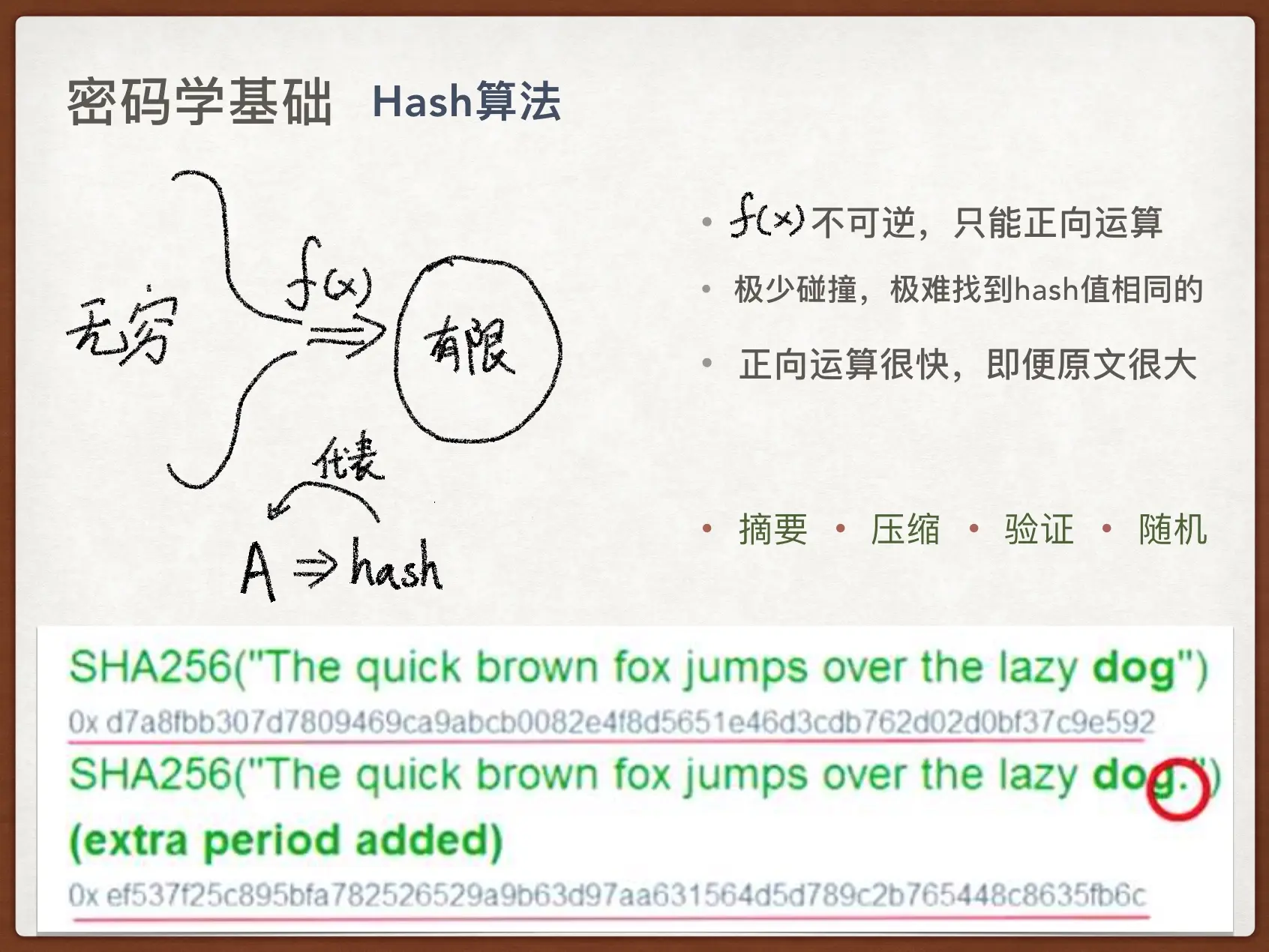 有了以上这些特性我们基本上可以用一个 hash 值去代表它的原文了,因此 Hash 算法广泛应用于信息摘要、压缩、验证、随机,如果你不理解随机,可以看最下面这张图的例子,原文『dog』后面即便多一个『.』hash 值也会大相径庭,可以说得到的 hash 值非常随机了。如果你想得到某个指定的 hash 值,你只能一次次的枚举原文,尝试得到指定的 hash 值。