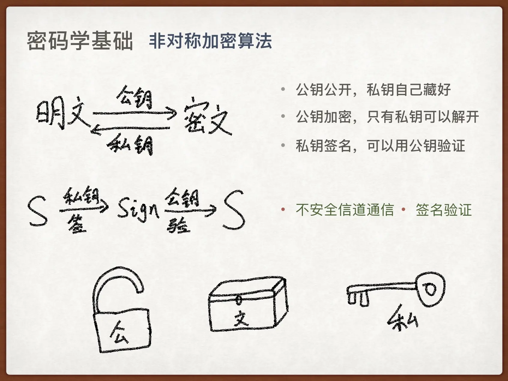 你要给别人发消息的时候,对方可以放心大胆地把公钥发给你,你用公钥加密好密文后再发给对方,对方再用自己的私钥解开。这一切在不安全信道传输一点问题都没有。这就类比于,A给B一把锁,只有 A 有钥匙,B 拿到锁之后,把箱子锁起来再交给 A,这样搬运箱子的快递员怎么也打不开箱子,只有 A 能拿钥匙打开。