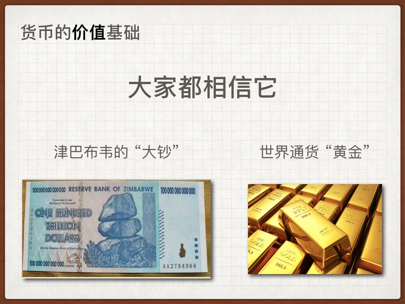 如果你思考足够深入,就会发现一种货币值钱的原因是所有使用它的人都相信它值钱。我们认为人民币、美元值钱,是因为我们信任政府,相信政府能给我们提供美好生活的保障,让我们手里的这些纸片一直能够花的出去。而在一些战乱的国家,这些政府发行的纸币就很不值钱,因为你不知道哪天政府就会垮台,你手上的钱就变成一张张废纸了。再比如津巴布韦的 1014 面值的钞票,也是因为政府毫无信用地滥发钞票。再想想为什么黄金没有政府背书,却可以成为全世界的『硬通货』?也是因为人类有一个共识,Au 这个金属元素单质稀有且不可人工合成,化学性质稳定,全世界的总量有限。