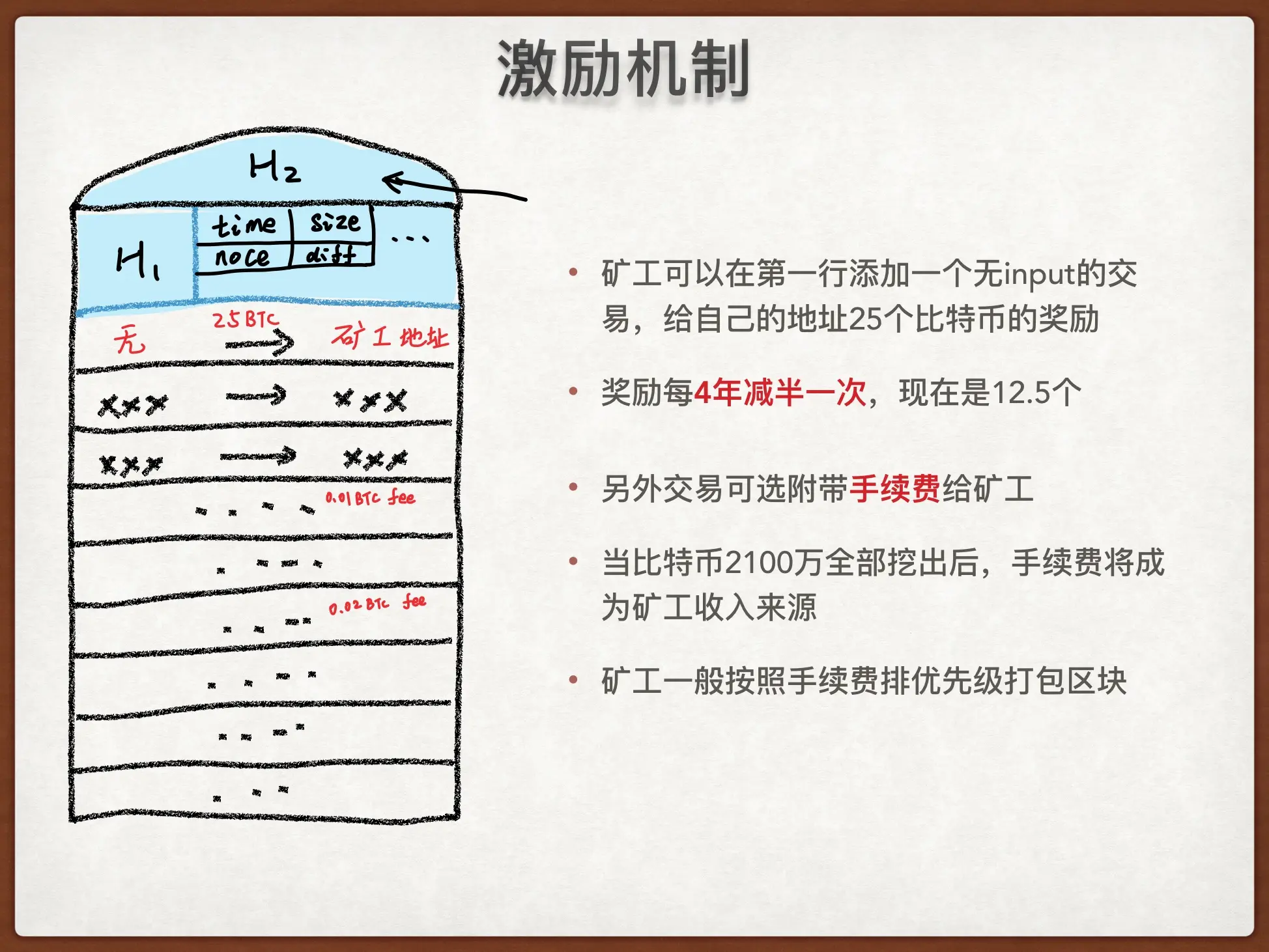 大概在100多年后,奖励将少于比特币最小计量单位:1聪,2100万的总量全部开采完。到那个时候矿工还有动力挖矿吗?有的。每笔交易都可以选择性附带手续费,当2100万比特币全部挖出后,手续费将成为矿工的收入来源,事实上,目前为止手续费也是矿工的收入来源之一(未来会成为重要收入来源)。矿工甚至会按照手续费高低的优先级来打包区块。因为区块的承载能力有限(目前1-2M大小,约2000条交易),当交易数量变,交易变得拥堵,手续费低的交易会被推迟打包进入区块,从而促使人们提高手续费。
